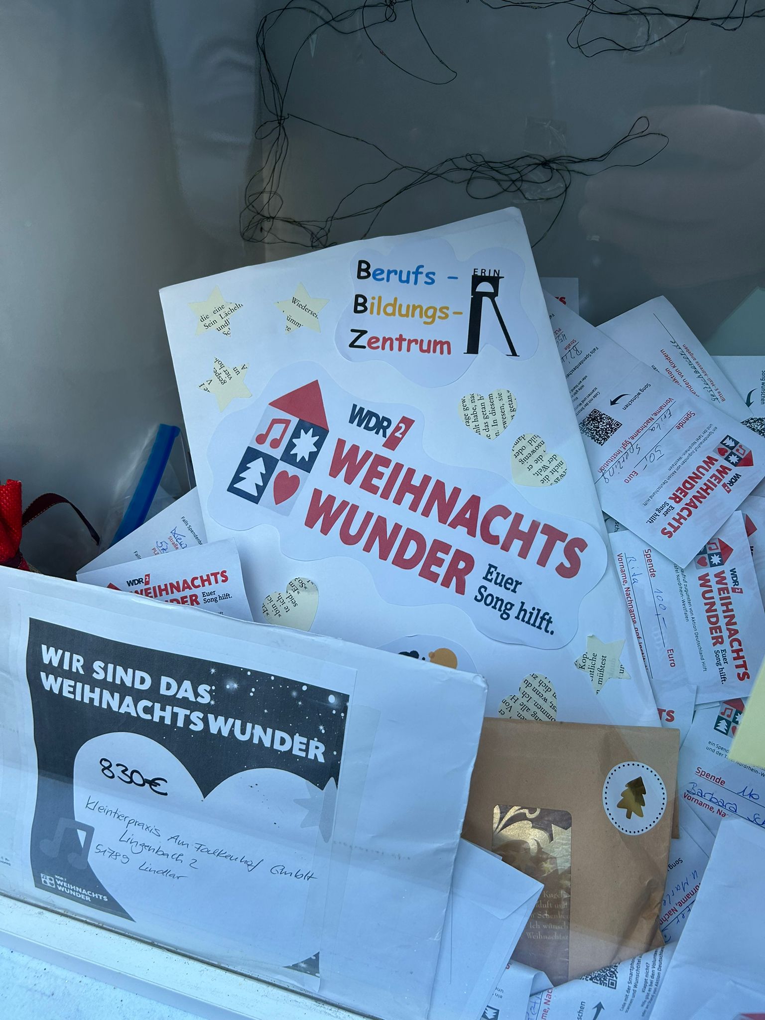 Bereits über das gesamte Jahr hinweg hatten Jugendliche und Mitarbeitende im BBZ zurückgebliebene Pfandflaschen gesammelt, gezielt mit Blick auf das Weihnachtswunder. Der Erlös wurde gemeinschaftlich gespendet und am 16.12. persönlich in Essen übergeben. Der dazugehörige Song wurde tags zuvor im BBZ aus den eingereichten Vorschlägen der Jugendlichen ausgelost.